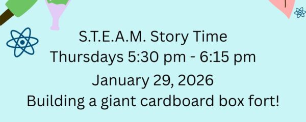 On Thursday January 29 we’ll be making giant cardboard box forts as part of the STEAM Story Time program. Join us at 5:30 PM.