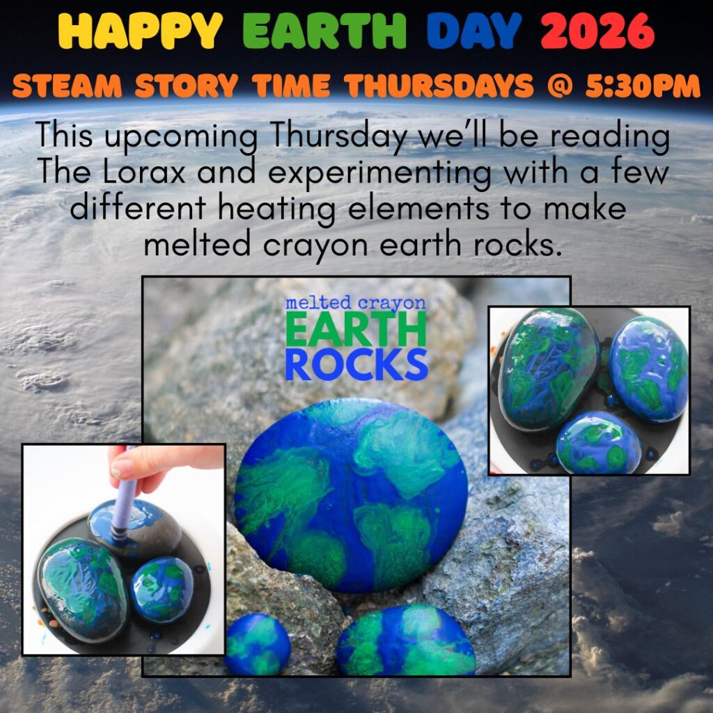 This Thursday we’ll be reading The Lorax and experimenting with a few different heating elements to make melted crayon Earth rocks.
