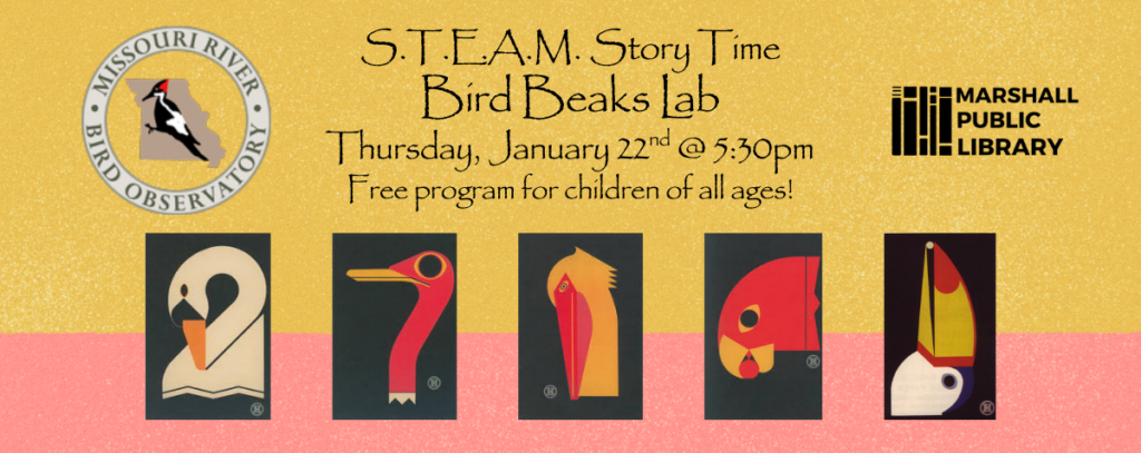Melina from MRBO will be at the library to run the Bird Beak Lab. Here’s how it will work: children will use different tools as “beaks” (for example, chopsticks and tweezers) to collect a variety of “food sources” like pasta, seeds, and peas. As they experiment, children discover which beak is most effective for each food type.